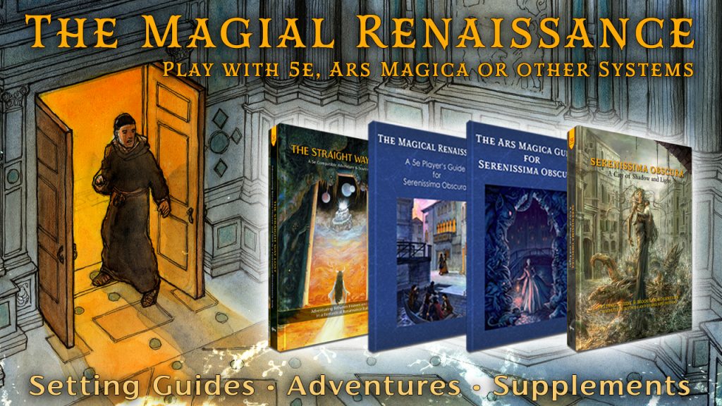 Serenissima Obscura– Setting Guide and Modular Adventure for 5e, Ars Magica and other Systems will be available in spring. Pre-order it now and profit from the campaign-only supplements.