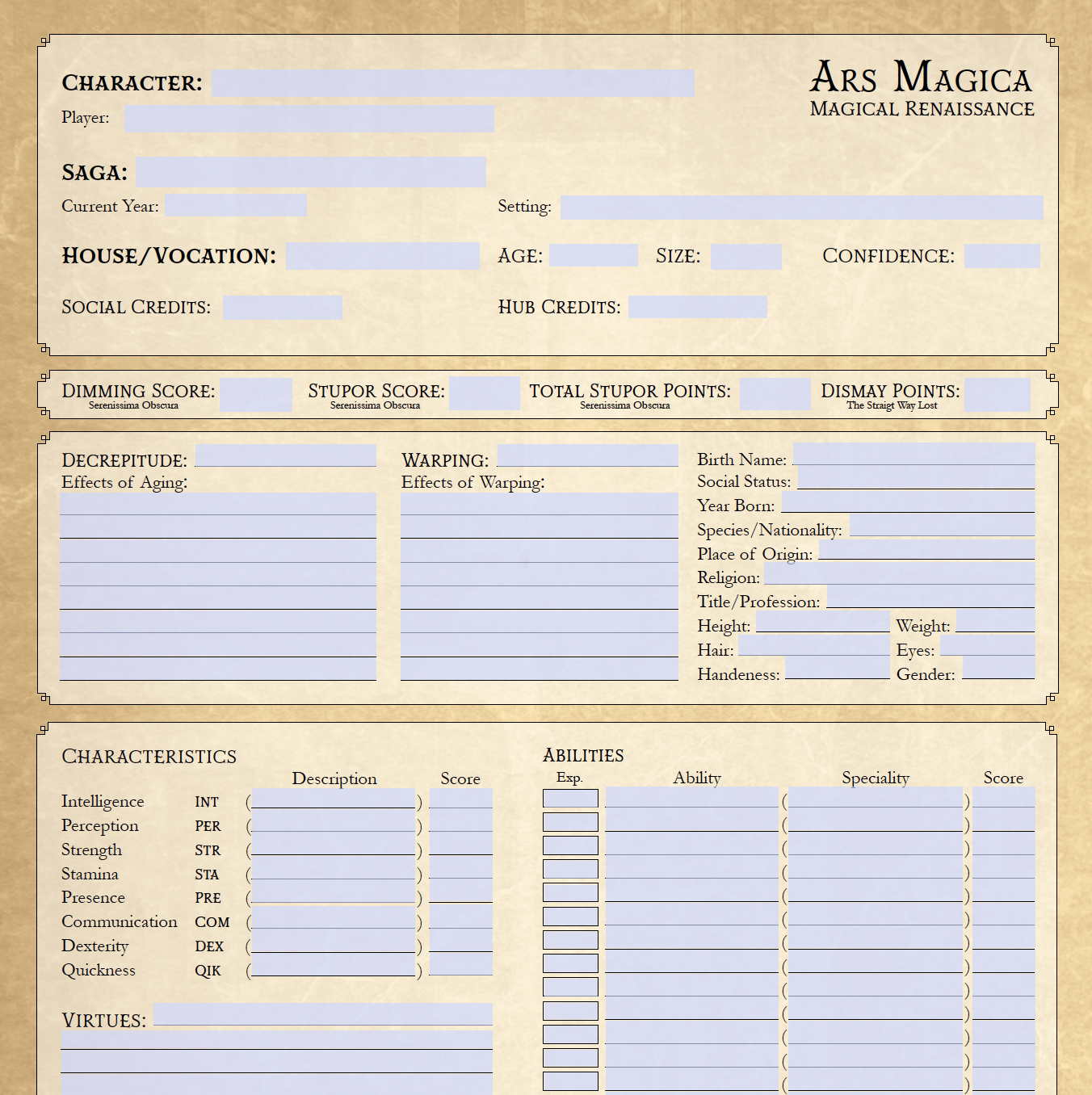 A 6-page form-fillable character sheet for Ars Magica designed specifically for The Magical Renaissance.